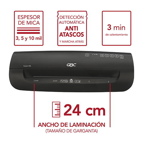 Caracteristicas:Para micas de hasta 24 cm de ancho (carta, oficio y medidas pequeñas)Funciona con grosor de mica de 3, 5 y 10ml Tiempo de calentamiento: 3 minVelocidad de enmicado: 330 mm x minApagado inteligente: despues de 30 minutos de inactividad se apaga en automaticoSistema de reversa anti atascoNo utiliza carrier